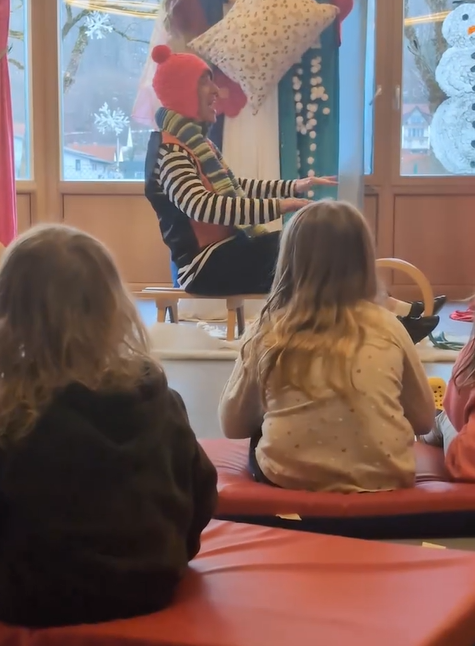 Und heute durften wir live erleben, wie Marie zu Goldmarie wurde ✨💛 – wie Fleiß, Freundlichkeit und Hilfsbereitschaft belohnt werden. Gespannt fieberten die Kinder mit, als Marie die Kissen schüttelte, das Brot aus dem Ofen nahm und den Apfelbaum von den reifen Äpfel befreite.🌟❄️. Passend zu der Geschichte fing es draußen auch noch an zu schneien. Das war sehr magisch für die Kinder.